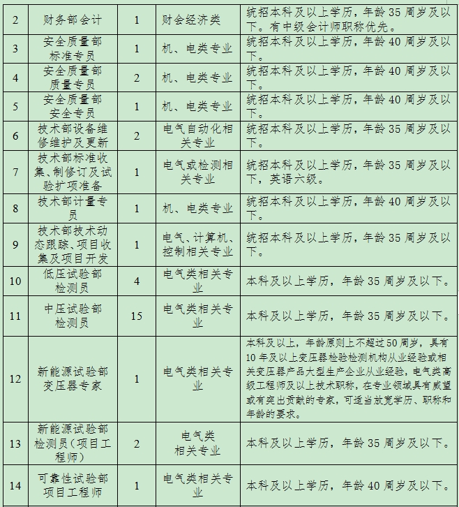 根據(jù)公司經(jīng)營發(fā)展需要,現(xiàn)面向社會招聘行政管理、財務(wù)、安全質(zhì)量、變壓器專家、市場管理、檢測專業(yè)人才,有關(guān)事項(xiàng)公告如下: